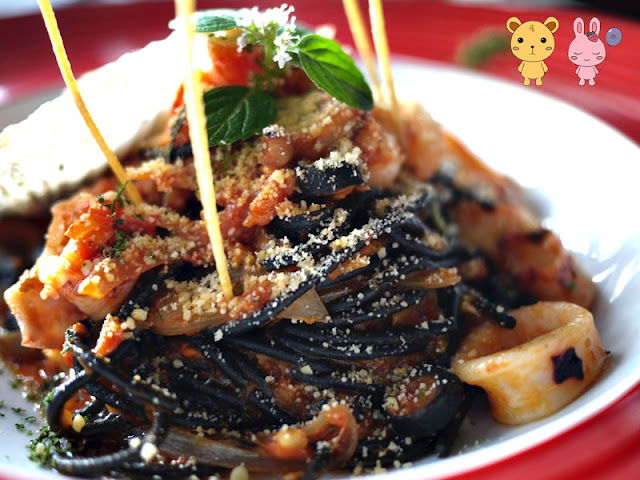 接下來是我們今天的重頭戲【海鮮總匯墨魚麵】,此部分可以選茄汁或奶油醬,不過熊覺得,如果能用墨魚汁會更棒,後來只好選了茄汁。