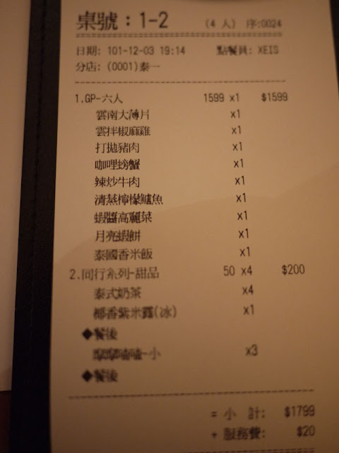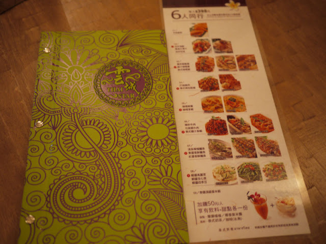 您們瞧瞧...這哪點像是泰式料理店的佈置阿,一整個很詭異,哈。這是當天的菜單,不過我們是用6人同形的團購券,4個人去吃這樣。