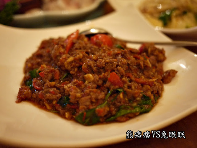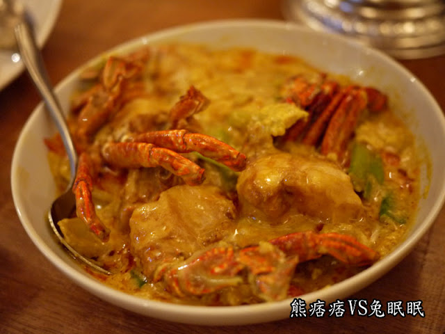 這是打拋豬肉,他們家的打拋豬肉對我來說,沒有很辣,鹹度正常,很適合配飯一起吃,如果想要吃很辣的,建議可以找大墩上附近的那間泰式料理店。這是咖哩螃蟹,看到時眼睛大亮,因為熊是螃蟹控,很喜歡吃這種東西,不過這家的咖哩味很淡,螃蟹本身是不錯吃,但吃多了會小膩。