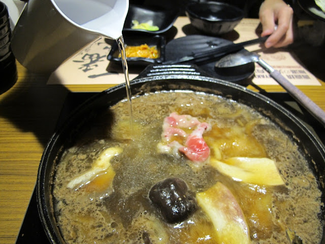 當然在上食材的同時,店員已經在幫我們準備壽喜燒的起鍋,先用洋蔥拌炒,讓洋蔥的香氣溢出,再加入壽喜燒的醬汁,就變成醬燒,就可以開心涮肉、菜、麵,然後把肚子填飽飽。