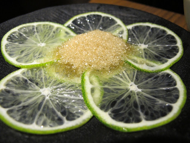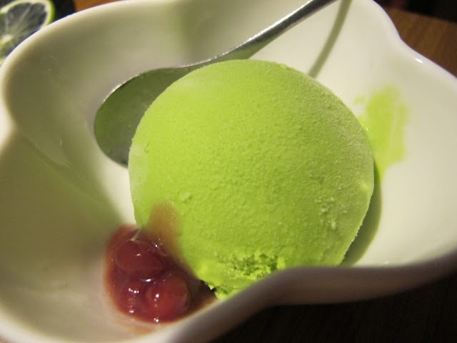 甜點是檸檬片跟日式抹茶冰淇淋,檸檬切的薄博的,再撒上細砂糖,吃進嘴裡一點點苦一點點酸,然後有砂糖的地方就會甜甜,可以把口感轉換一下,也可以解膩。