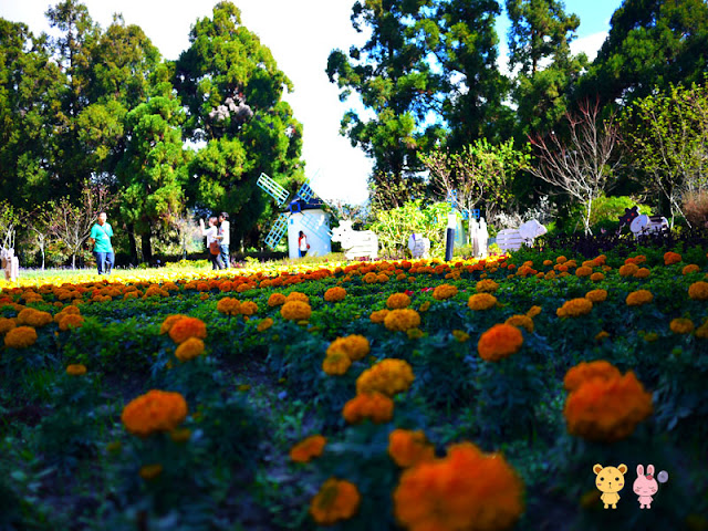 一朵朵看似球狀萌發的花,在荷蘭風車與大地的映襯下,展現出最傲人的橘黃。