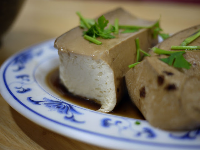 【台中逢甲】五里亭麵食館:豆腐部份很大塊,混著香菜的香氣搭配滷汁一起吃還不錯,豆腐很嫩唷!最後我們都是用湯匙在挖豆腐吃的。(不在逢甲夜市內)
