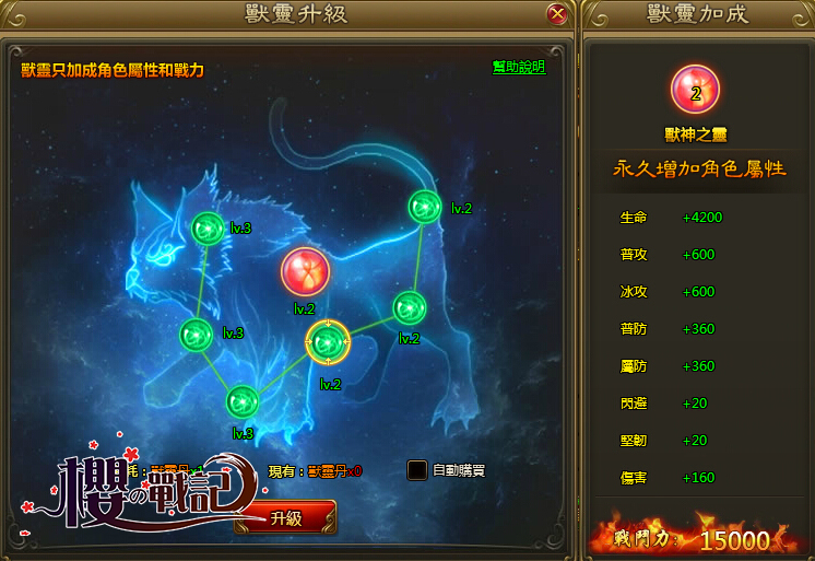 在「獸靈系統」介面中,玩家可點擊升級介面中6種屬性節點,節點每升一級,靈獸相應的屬性都會得到提升,當6個屬性節點全部都升級之後,獸神之靈的等級也會隨之提升,且直接為角色帶來更多永久屬性加成。