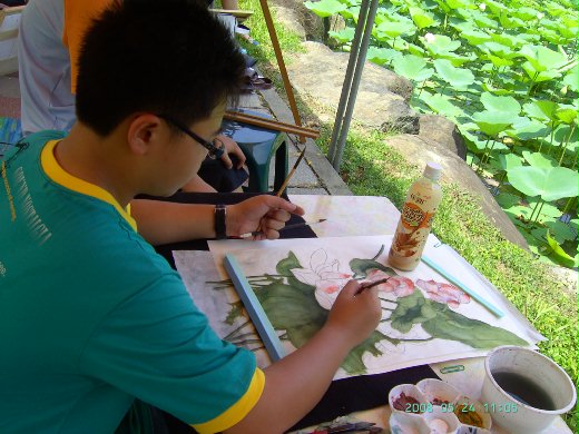 (中央社記者葉子綱雲林縣二十四日電)雲林科技大學荷花池畔,今天散發「畫荷風情,音樂飄揚」氣息,大人小孩兩百多人,圍繞池畔作畫,用生動畫筆,啟動荷花、琴韻、蟬聲交映的藝術饗宴,不像是畫荷比賽,反而更像是夏日賞荷的景象。