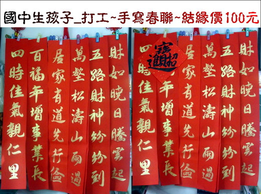 、這是我家孩子作品、今年開始有勇氣寫春聯試賣賺取零用金、非常感謝孩子書畫老師帶他到處實習、練習
