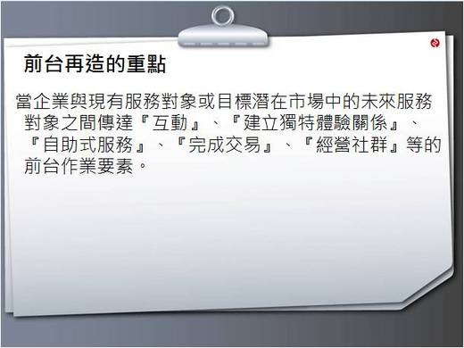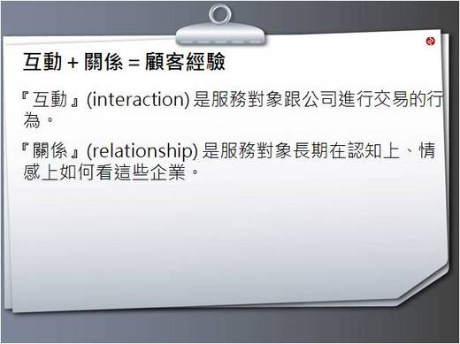 同時,為前台的互動和關係經營上訂下具體的策略,最佳化前台所有可能的服務介面或流程,為的是:要讓服務對象,擁有【互動、關係】的體驗價值。