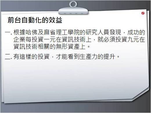 根據哈佛及麻省理工學院的研究人員發現,成功的企業每投資一元在資訊技術上,就必須投資九元在資訊技術相關的