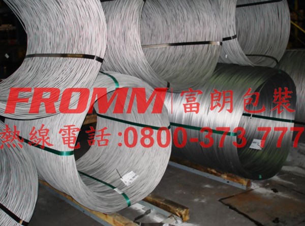 【FROMM 富朗包裝】為綫材盤元包裝物,提供了包裝解決方案,配合高拉緊力摩擦熔接式塑鋼帶電動包裝機頭MH610,拉緊力高,打帶捆包速度快,加壓裝置等客製化機構,完全達到自動化包裝需求,CE安全認證。