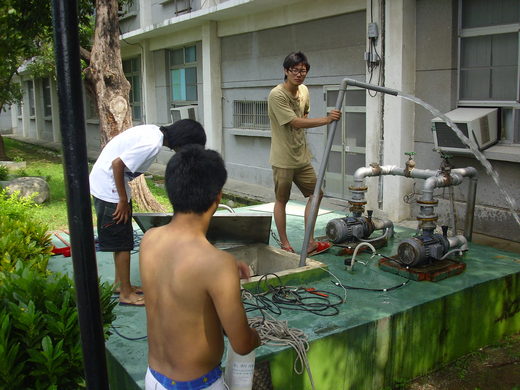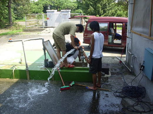 今年希望這個有人性的單位, 能在夏天洗水池, 心理想, 應該有水玩,不會熱吧. 哪裡知道, 下到水池中, 沒有五分鐘. 空氣悶以外, 又熱又潮濕, 我勸他們趕快洗一洗, 等一下到台糖冰廠去吃冰, 我請客. 水池中, 有汙泥, 樹葉.青苔都要刷洗乾淨. 今天的進度. 四個水池刷完就OK了,