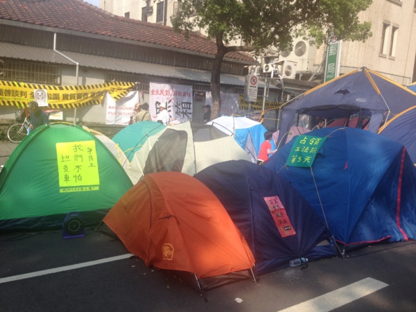 抗議民眾自備的一頂接一頂小帳篷,較大的一尊裡頭正舉行著小講座。