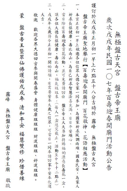 最新消息 新春團拜開廟門活動內容公告 謹訂於丁酉年正月初一早上6:30 於盤古行宮前廣場集合 一、 本宮將於丁酉年正月初一早上7:00開廟門 集頭香新春團拜,前來參加之信眾不分老少 可領取專屬...
