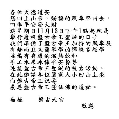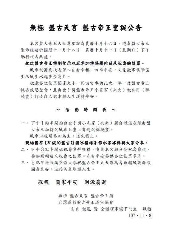 國曆11月13日,農曆10月14日,提前為盤古帝王祝壽,邀請 各位大德上山來參典,盤古公交代不可鋪張浪費,帶著快樂的心回來 山上就好。當日有祈福儀式,前來祝壽弟子、信士可參與祈福,並有 機會獲得盤古帝...