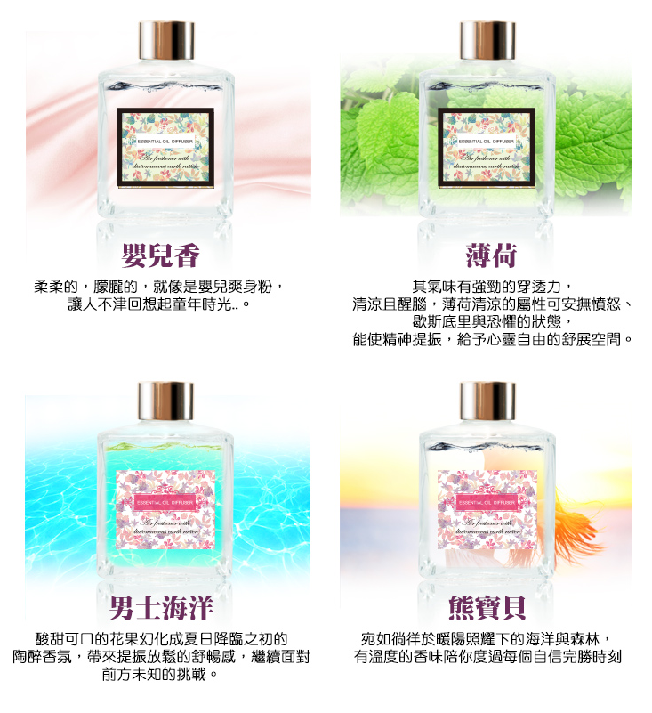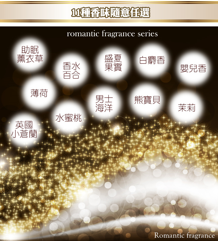 香味:薄荷、茉莉、薰衣草、盛夏果實(果香甜味)、香水百合、白麝香、嬰兒香、陽光馨香、海洋、水蜜桃、英國小蒼藍