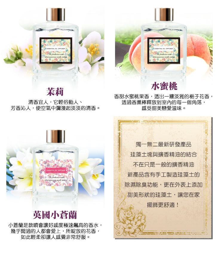 春花限定法國精油擴香瓶,台灣製造值得信賴~ 採用全新珪藻土擴香棒,擴香範圍擴大且揮發速度快,加上可除濕除臭,使空氣更芳香~ 搭配法國高級精油,可改變室內氣息,使生活品質更加優喔!現有多款香味,任您挑選~ 讓環境充滿春天的氣息吧~