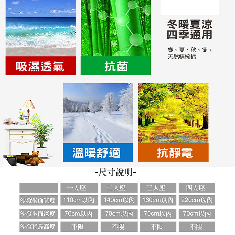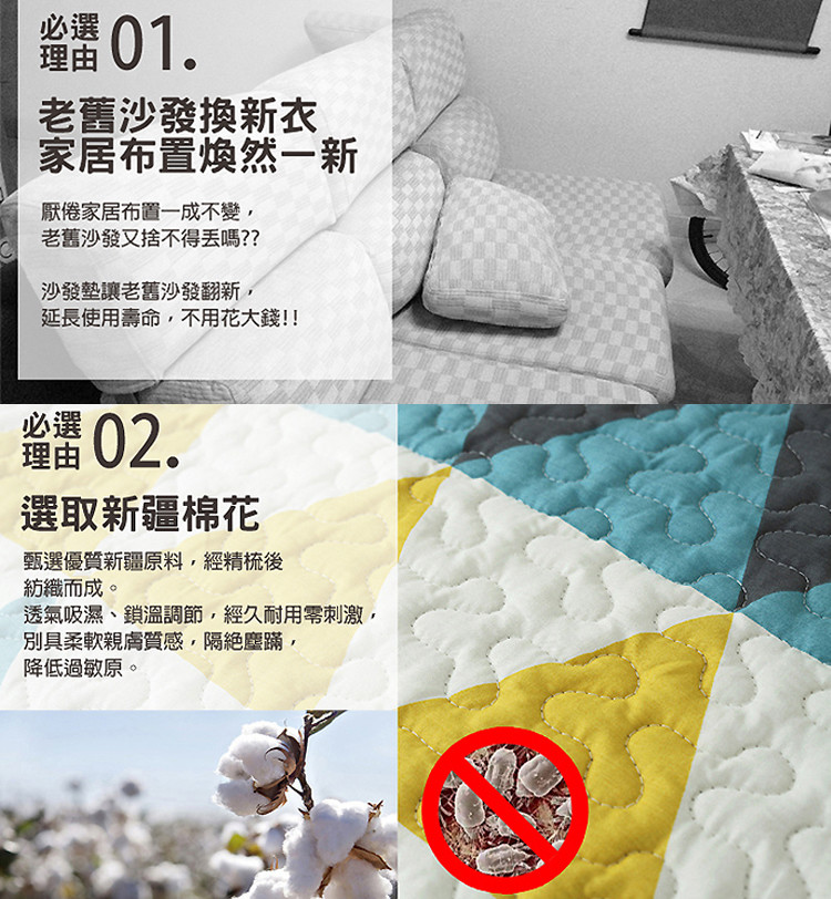 精選親膚棉質料,透氣吸濕,冬暖夏涼四季皆適用,放上沙發墊後延長使用壽命,不用怕沙發髒了洗不掉,精緻的繡花工藝,立體感十足,不起毛球不褪色,背面使用乳膠顆粒有效防滑,坐著不隨便位移,多款任選,為沙發挑選新衣,家居佈置煥然一新~