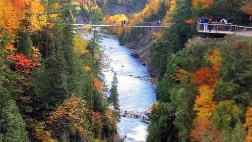 圣安妮峡谷进入秋季后层次丰富的红色令人叹为观止。这座峡谷由大大小小的瀑布、激流穿插于峡谷之间,郁郁葱葱的树木点缀其间,与瀑布相互辉映。一到秋季枫红时节,景色更加迷人,被人们誉为魁北克的“枫”景之最。由于枫叶分布在谷底、山腰和山顶不同的位置,因此其变红的时间也有所不同,形成绚烂无比的层次感。