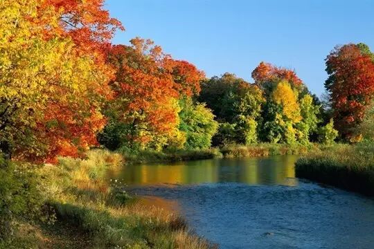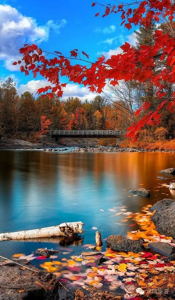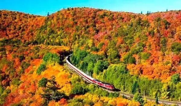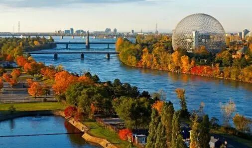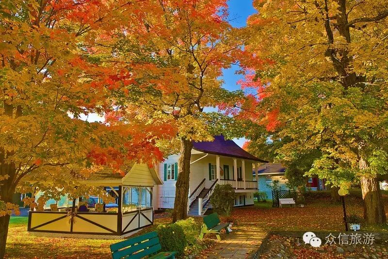 圣劳伦斯河与“枫叶大道”平行,1000多个大小湖泊星罗棋布,形成了湖畔、河边、路旁枫叶红于二月花的美丽景观。