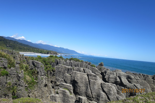 Pancakerock(鬆餅岩)走,途中一處海灣水藍礁石美,我們停車欣賞與拍照後繼續往前開,開