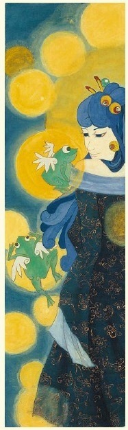 理念~月神常羲生了十二個月亮(玉蟾),玉蟾題材取自漢代墓室中的畫像磚。造型與用色上,月亮給人的感覺是害羞、內斂的,所以月神是背對觀眾,顏色則是用大量的寒色系。紙張是用自己製作的夾紙--兩張紙上糊相疊粘在一起(半熟紙),以工筆重彩繪之。
