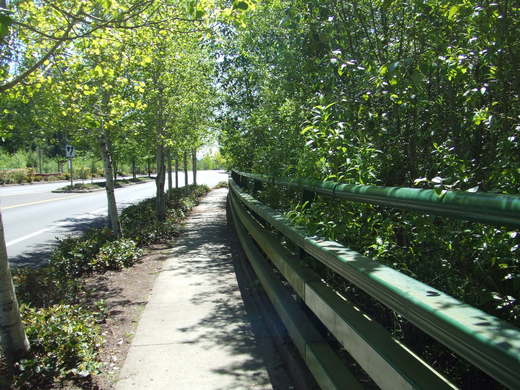 前方看似一座綠橋, 其實是溼地與人行道, 分隔的圍攔. 五月這個季節走過這兒, 視野寬廣, 蒼綠悅目. 除了樹影婆娑林間, 啄木鳥的聲音更是此起彼落的, 叩叩叩叩--- , 不停作響, 認真啄食著高杉樹幹裡的小蟲子.
