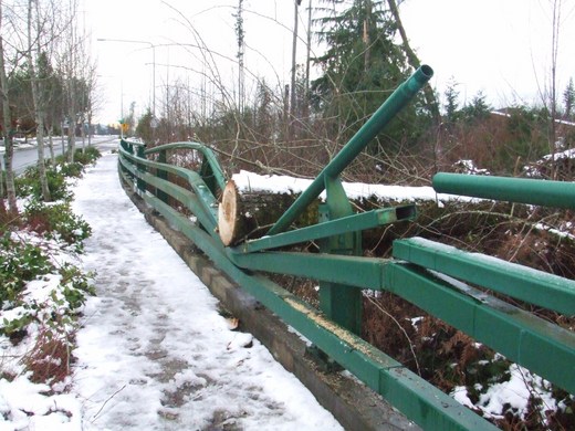 看到雪中的腳印嗎? 其實這棵大樹倒榻時, 是橫著截斷這條人行道. 初步為了引出一條走道, 你所看到的樹木年輪, 是切樹公司第一階段把樹幹, 先切斷移走了. 之後, 社區再慢慢花了近一年半才完全修好.