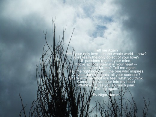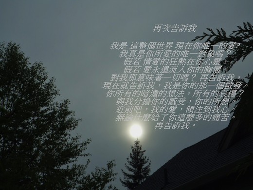 很喜歡在每一本書的內頁, 都有你細心的留下想說的幾句話。對我而言,那是一種表達感情存在的筆跡。其中一本書名是 “在寂靜的邊緣歌唱"。 每一篇都是女性詩人的作品。看了這一篇土耳其作家 Nigar Hanim 所發出濃厚強烈的愛。總是在想---有人真會如此嚇跑所愛的人,還是就是會見到, 願意接受如此主導性口吻。 可能是因為作者的民族性格背景有關? 或許只是很多人感情悸動迫切的表語吧!