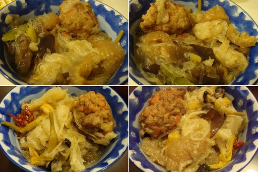 老一輩的人不愛吃全瘦的絞肉,所以喵媽買的絞肉裡參雜不少的肥肉,因為講也沒用,喵喵趁著拌肉時偷偷挑掉一大堆,順時鐘方向拌到肉出現黏性,放到冰箱冰鎮入味,取出加點麵粉增加黏性,炸成適當大小的肉丸,不要炸到熟,只要肉丸定型就可取出。過程到這兒跟以前一樣,接下來就變調了………
