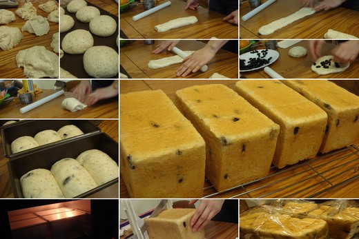 表嫂今天打算包蜜黑豆,我們將一早就已經瀝乾水分的黑豆,用紙巾擦乾殘餘的水分後,把圓圓麵團桿成長條、擠出氣泡、灑上黑豆再捲起,隨即放入吐司烤模,喵喵在這個步驟也有參與,做了最後一條吐司所需的3個麵團,表嫂稍稍預熱烤箱後關機,放入吐司烤模及一杯熱水,充當臨時的發酵箱,進行最後一次的發酵。