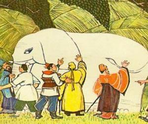“瞎子摸象”典出《大般涅磐經》卷三二。說的是一群瞎子想知道大像是什麼模樣,他們圍著象摸。摸到鼻子的說大象像一根管子,摸到耳朵的說像一把扇子,摸到牙的說像一根蘿蔔,摸到像身的說像一堵牆,摸到腿的說像一根柱子,摸到尾巴的說像一條繩子。於是,“瞎子摸象”成為一則成語,用來諷刺那些觀察事物片面,只見局部不見整體的人。