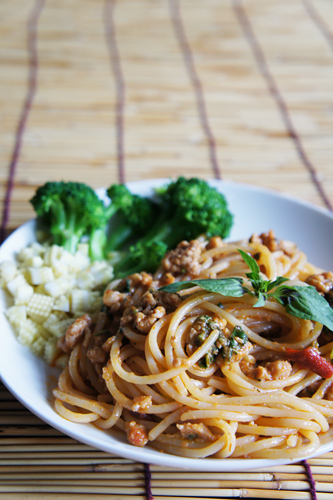 ,還是很自我的選用了番茄羅勒義大利麵醬,加上豬絞肉、
