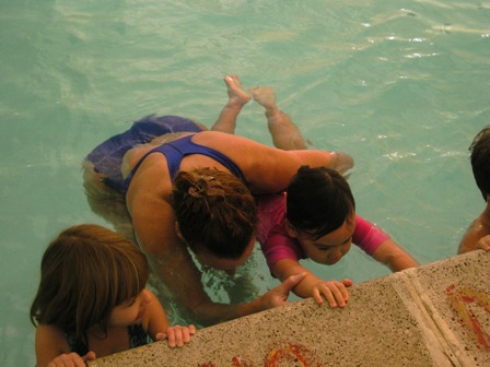 6月25 日,天氣有些悶熱,是個適合游泳的日子,至少這樣的氣溫不會讓nana凍得嘴唇發紫、全身發抖。Hood 的水總是不熱,即使在太陽下曬了一整天,水還是冷得讓人得深呼吸加憋氣才敢下去。這是今年第三次游泳,整個夏天就短短幾個星期可游,若再加個午後雷陣雨泳池關閉,nana實在沒什麼練游泳的機會。她老是像浮標一樣在水中晃來晃去,就是不把身體拉平了游。從十一個月大第一次去 YMCA上課,休息,到Hood上water baby,然後是last summer’s blossom,她總是給我們驚喜,總是全班最棒的泳者,可是…可是…她就是不把頭潛入水中游。