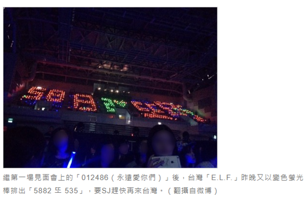 我自己個人就覺得螢光棒在很多演唱會很不可或卻,甚至像是現在因為科技越來越進步,手中的螢光棒還可以被場空控制在幾分幾秒會轉變顏色,自己覺得真的很奇妙,那種時候你看自己不壯觀,但你看到不同座位區歌迷手中的螢光棒顏色轉變節奏,都會覺得天啊~這個黑科技真的太強大了啦!除了這種由舞台場控的螢光棒讓人覺得演唱會的美妙外,更讓我驚奇的是台灣歌迷的排字能力,相信不少人在新聞常常看到韓星來台辦見面會,粉絲都會成群結隊展現粉絲滿滿的心意,螢光棒或是排字版的方式,把他們想說的話透過座位的計算排出完整的告白留言,往往都讓韓國偶像歌手們對台灣應援印象超深刻的,就像下圖新聞圖這樣,E.L.F就是這樣讓韓國男團SuperJunior深陷於台灣粉絲的這種應援魅力呢~~