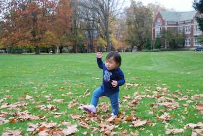 波特蘭的秋天美是很美,只可惜常常在下雨,所以往往不是因為下雨無法出門賞秋,就是天氣晴時色彩繽紛的葉子都已經被雨給打掉了,今年就是這個情形。週六那天,我們眼看秋天就要過去了,卻一張照片都還沒有拍到,於是下定決心,利用幾個小時沒下雨的空檔,找個地方去給妹妹留下一點秋天的回憶。這一次,我們選擇了位於波特蘭西南區的Reed College.