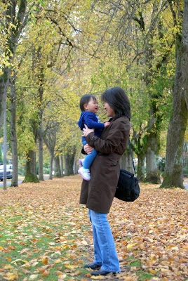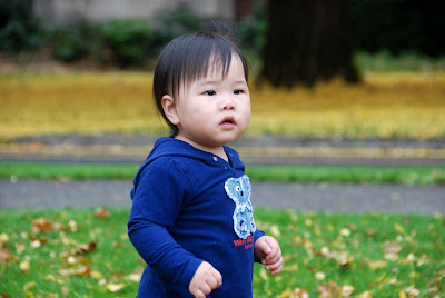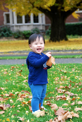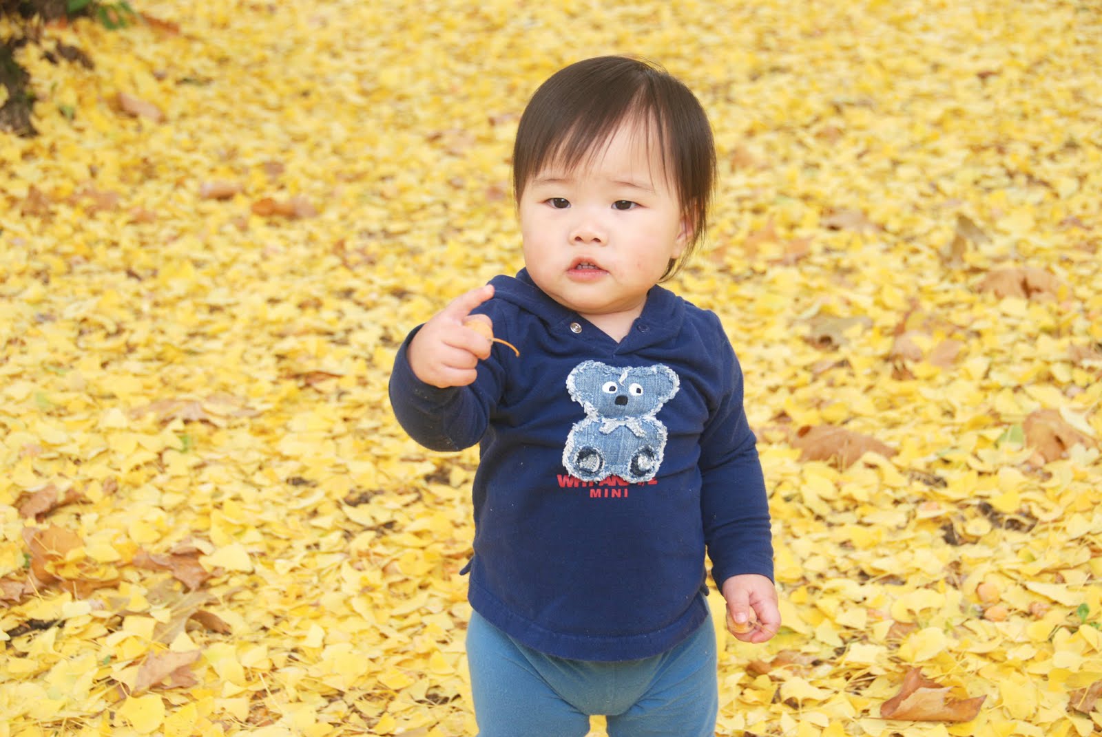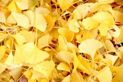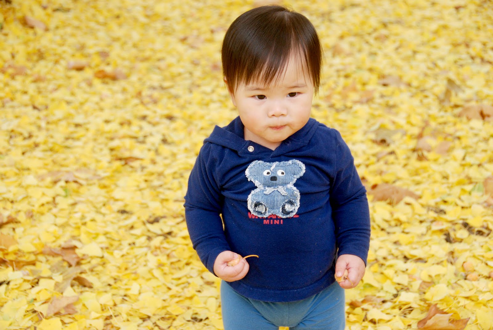 後來我們注意到三個亞洲婦女蹲在地上,好像在尋找什麼一樣,還是媽媽眼尖,馬上就發現這是銀杏。我仔細一看,真的,那她們一定是在找果子,要採集裏頭的銀杏子(白果)咯。我們也跟著她們在葉子下翻,果然看到許多小小的銀杏果,靜靜地躺在一片片扇形的黃葉下頭。小恩恩沒見過這等景象,好奇地東走西瞧,手上抓了兩顆捨不得放,還不停地發表感想。後來一不小心滑了一跤,還抹了我一身溼溼軟軟的銀杏果子,那氣味該用什麼來形容呢?這麼說好--過了不一會兒老公不停地懷疑他踩到了狗屎--就是那個味道。可惜美美樹又營養的籽,竟然配上這種獨特的「香氣」,讓人又愛又怕。