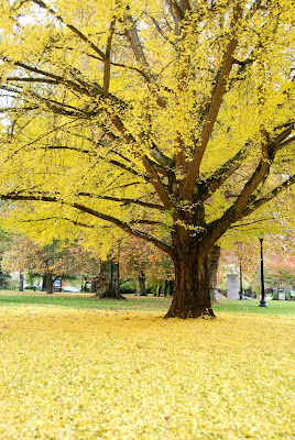 來過Reed College好幾次,但每次都是來聽演奏,所以從來沒花什麼心思欣賞風景。車子在停車場停下來,一行人推著小車上的小恩恩,慢慢地在滿是落葉、微溼的地上行走。走沒多遠,從圖書館旁轉過彎,眼前就展現出了一片金黃,黃澄澄的樹頭輝映著滿地同樣是黃澄澄的落葉,一見到這幅景象我們就再也移動不了腳步了。