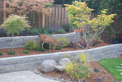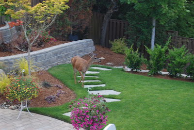不知道牠是打哪兒進來的,我們趕快拿起照相機和攝影機開始拍攝。牠起先吃我們的海棠葉,心想就讓牠吃吧,沒想到牠越吃越開心,竟然啃起小藍莓來。這一下我就急了,趕緊跑出去趕牠。這頭鹿一看到我們出現在陽臺上,嚇得到處跑,在院子裏不停地兜圈子,想找路出去。看牠頻頻地跑向圍牆邊往外觀看的樣子,可以猜出來牠是跳墻進來的。