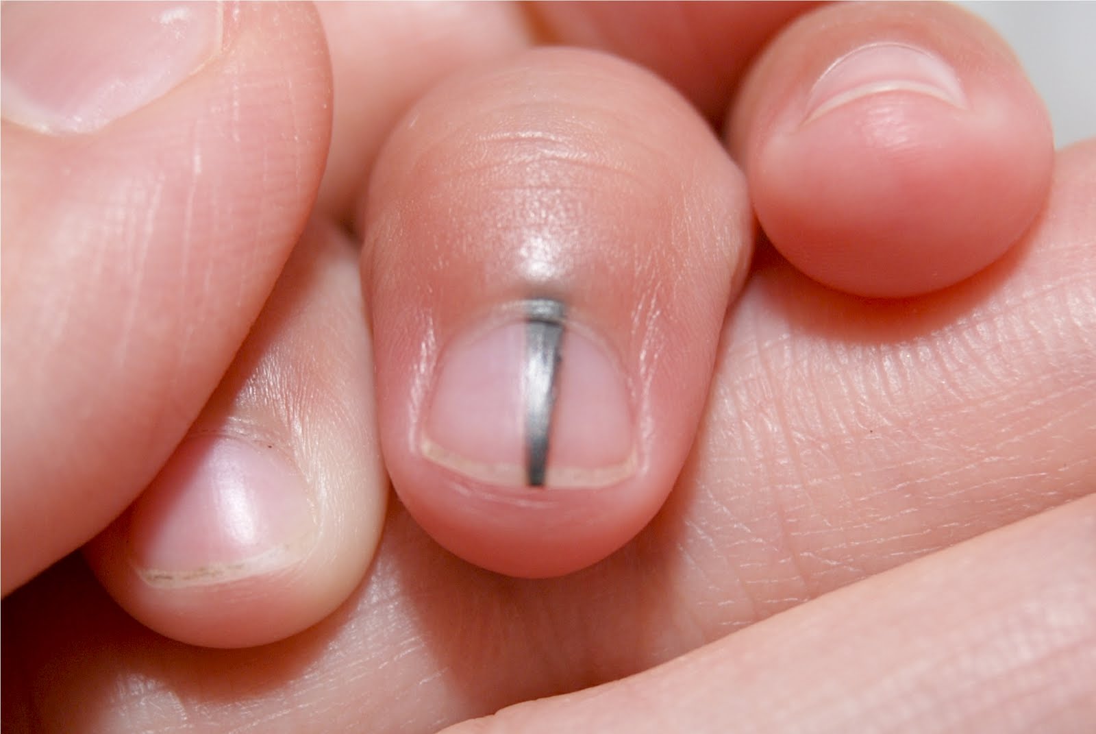 不查還好,一查之下我簡直要崩潰了。網際網路是一個資料豐富的地方,幾乎什麼都查得到,但是由於資訊汎濫,有時真的會嚇死人。基本上指甲附近的黑色素不多而且多呈休眠狀態,會造成這種指甲長線現象的原因有許多,除了淤血以外可歸為兩大類,一是黑色素因某些原因活動起來了, 另一類是黑色素增生。前者起因很多,受傷、藥物影響,都有可能,而後者則可能是因為指甲基質下長東西,可能是痣,但也有可能是讓人害怕的甲下黑色素瘤(subungual melanoma)。由於這黑色的線是從指甲基質(負責指甲生長的部分)下的皮膚長出來的,做切片時可能會造成永久性的傷害,輕者指甲變形,重者指甲再也長不出來。
