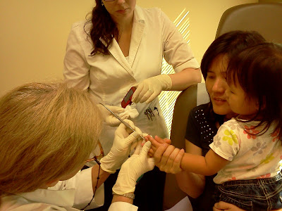 妹妹原先還強打著精神想看看我們到底在做什麼,但是後來還是不敵催眠的藥效,忍不住睡著了。醫生不停地稱讚妹妹,說她表現得真好又勇敢,忍不住幫她多照了幾張相。我想妹妹可能是她動過手術的病人中最年輕的一個,她曾提過替四五歲的孩子動手術,兩歲不到的妹妹應該是第一個。她是個國際知名的指甲專家,希望雖然這是第一次的經驗,但是不會影響她動手術的結果和品質。手術結束後,醫生又幫她打了一陣止痛針,延長她不痛的時間。