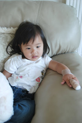 手術結束後,她們把妹妹的手指頭包了一大圈,弄得像個蠶繭一樣,怕她不小心踫撞了會痛,包紮好不久妹妹就醒來了,妹妹一醒來第一句話就是:「妹妹看好醫生了!」然後揮手跟醫生的助理說拜拜。我們才剛準備要離開,妹妹不知怎麼的手揮揮弄弄,那一大包蠶繭就掉下來了,我們只好重新再包一次。回到家後這個小傢伙因為麻藥還在,一點都不知道天高地厚,還不停地用她的左手,玩她那一大包上的貼貼,害我替她搶救了三次,最後還得重新包紮。