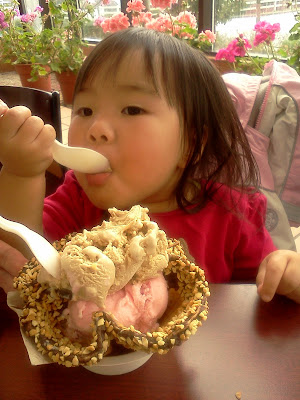 冰淇淋吃完了,出來後已經是下午三點左右,車子開了一段路,妹妹開口了:「媽咪,你肚子餓餓嗎?」由於我們一路上吃喝不停,又剛剛解決了一大碗冰淇淋,我當然不餓,但這時我忽然想起來,平常作息規律的妹妹是不是餓了呀?趕快問她餓不餓,她回答:「嗯!」這個小朋友,竟然不是直接表達她餓了,而是出人意料地反過來先問我餓不餓,真是個小靈精。