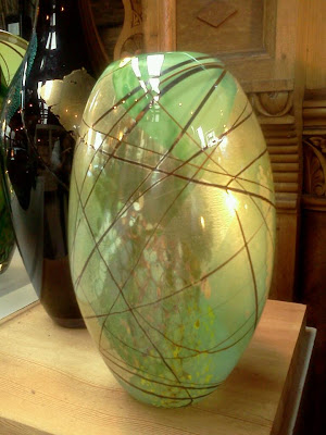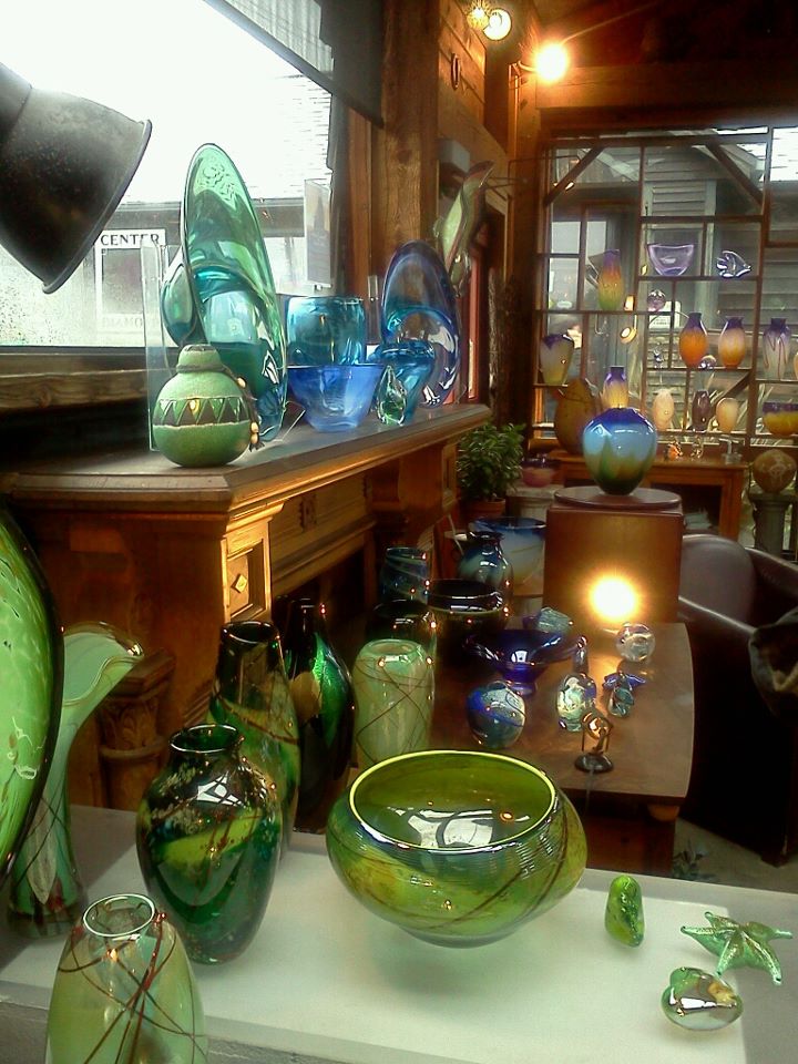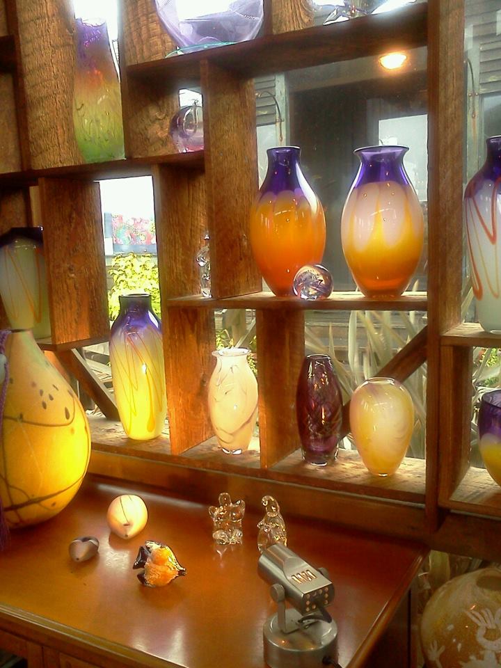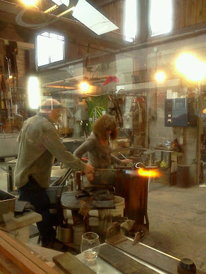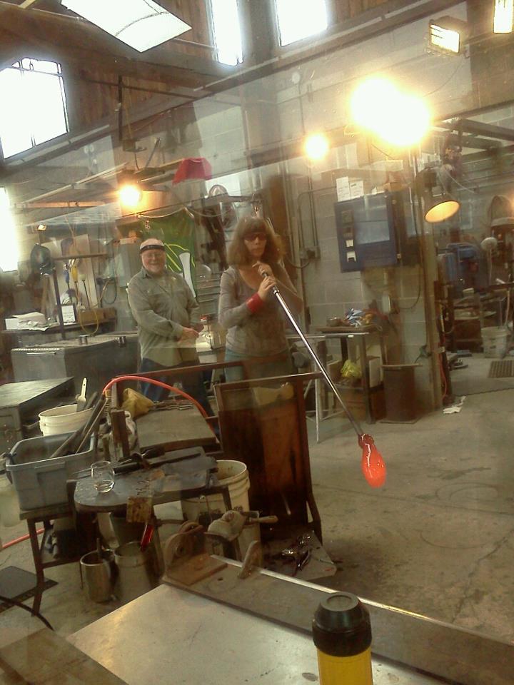 越往海邊開去天氣越糟,後來乾脆下起雨來了。到了Cannon Beach,這個春城無處不飛花的小鎮,此時路上冷冷清清的。由於下雨,我們連海邊都沒去,只到了過去曾經參觀過的一家叫做「冰火」(Ice Fire)的玻璃藝術工廠,一同去看他們吹玻璃。女藝術家用金屬棒取了一砣紅通通的軟玻璃,轉磨夾吹燒交互使用,加花時是沾了各色的玻璃細粉,還要另取一塊熱玻璃來加絲,再用夾子夾掉不要的氣泡,最後用另一根金屬棒把成品取下,然後放在九百度的箱子裏保溫過夜。