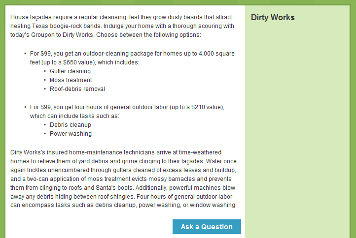 可是,近來大概是Groupon急於推廣生意,要與一些模仿的競爭者(Amazon Local,Google Offers)搶生意,對於商家的選擇和條件規範不如從前嚴謹,偶爾會發現服務品質並不如想像中的好,最近我甚至遇到了一個不負責任的roofing contractor(屋頂承包商),把我們氣得一口鳥氣真是不吐不快!