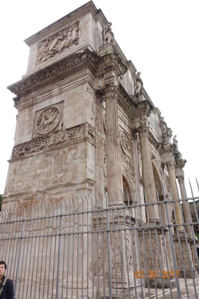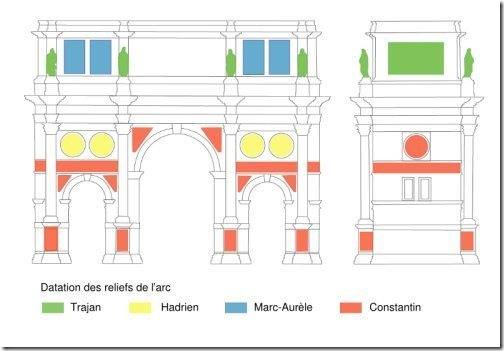 凱旋門為三拱式,中拱高大,側拱矮小,均以柯林斯式石柱(即柱頭飾以捲曲藤蔓植物)框飾,每個拱門上都有雕刻不同主題的故事。然而絲毫沒有基督教色彩,浮雕大多取自以前紀念性建築:「綠色」部分來自圖拉真廣場建築上的橫飾帶;「黃色」為Hadrien哈德良廣場上一系列盾形浮雕;「藍色」取自Marcus Aurelius馬克·奧爾略皇帝紀念碑;「紅色」則是Constantin。主要內容為歷代皇帝的生平業績,如安東尼、哈德連等,下面則是君士坦丁大帝的戰鬥場景。