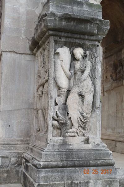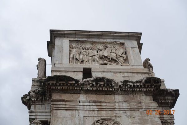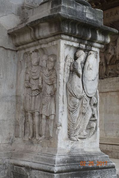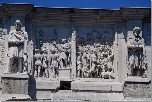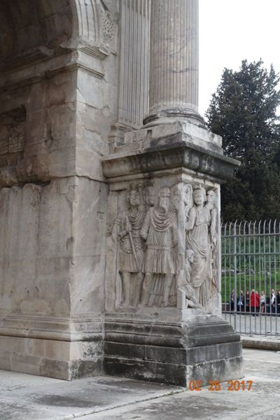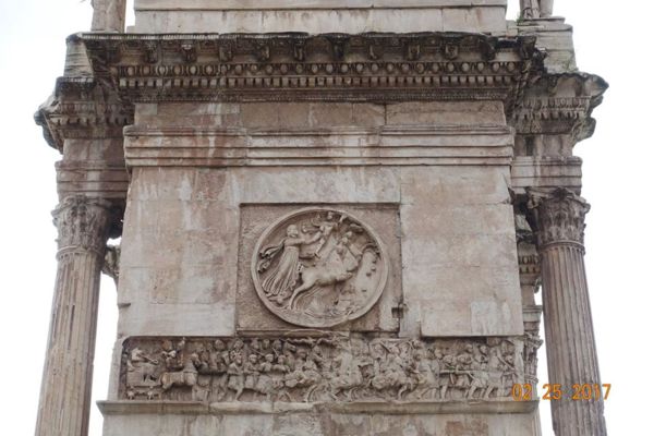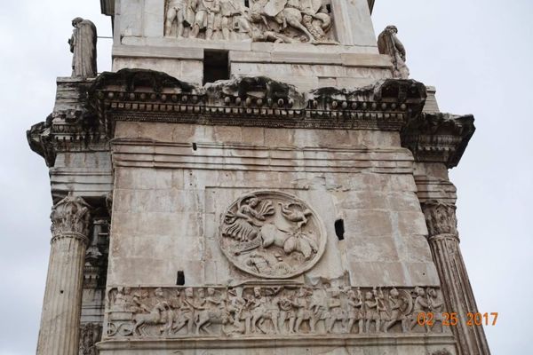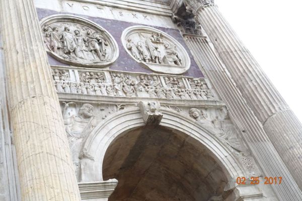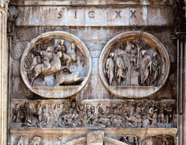 眾多浮雕中最著名的是凱旋門拱門上端兩側的8座矩形浮雕,浮雕原本是Marc-Aurele馬克·奧爾略皇帝(161—180)紀念碑上的裝飾。