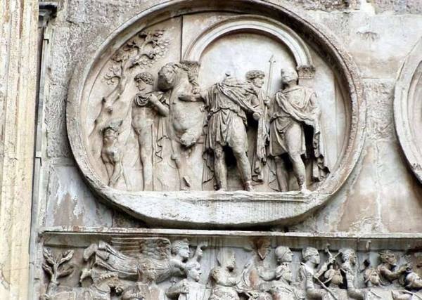 凱旋門南面取自哈德良廣場上一系列盾形浮雕:圍攻維洛納