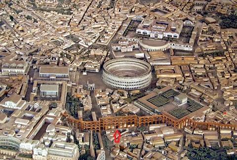 要表演海戰,就要往場中注水,水來自何方? 直到最近,考古學家才從考古挖掘中找到了答案: 注入場中的水,是引自附近高架的「克勞迪亞水渠」。 表演海戰時,地下層只有給水排水管道,野獸及角鬥士的預備區還沒建造,所以沒有漫溢至市區的問題 (古羅馬城復原圖。圓形建築物,為競技場;紅箭頭處,為「克勞迪亞水渠」) 引用自〝嘻辣人的擺寶箱〞
