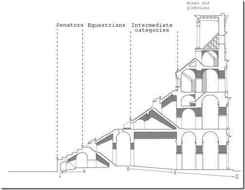 競技場觀眾席的設計:觀眾席約有60排座位,逐排升起,分4區:最下面的「Senators」榮譽席比「Arena」高5米多,是皇帝和貴族(如元老、長官、祭司)的座席; 第二層「Equestrians/Knights」是騎士等羅馬高階層市民席,比「一般平民席」高6米多,上層社會的安全措施很嚴密; 第三層「Intermediate categories/Plebians」為一般平民席,分「富人」與「普通公民」; 第四層的站席則是給社會地位最低如女人、奴隸和窮人使用。(網圖)