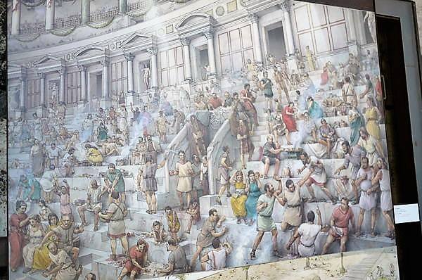 除了皇帝有專門的包廂和私人通道之外,其餘的人都得經過vomitorium(劇場或體育場的大出入口)散場。 因為散場時人潮會像嘔吐般散開來,後來就成為英文字的嘔吐Vomit