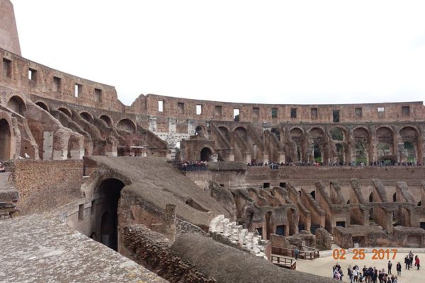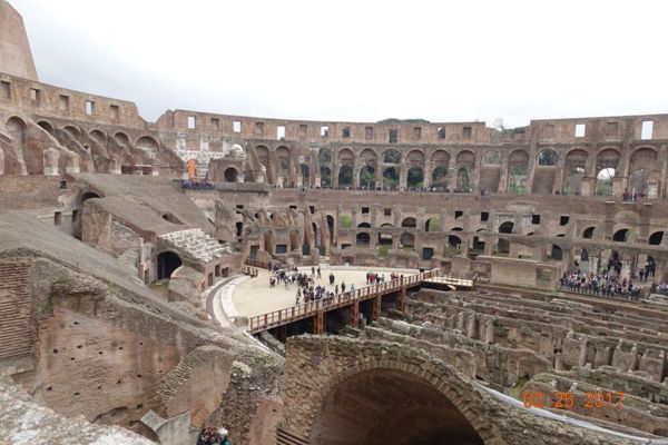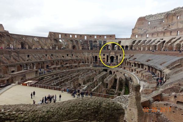 左邊半圓的區塊是「Arena」表演區 。原先有一個足球場那麼大!,長86m,寬63米,地面鋪上地板,再在木板上舖上一層吸血的沙,此沙有一名稱叫Arena ,因此義大利人也把競技場叫做Arena!